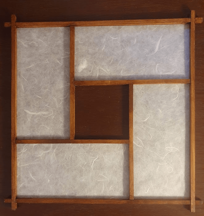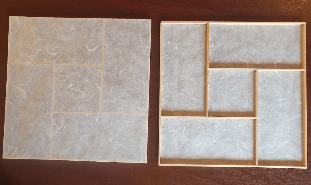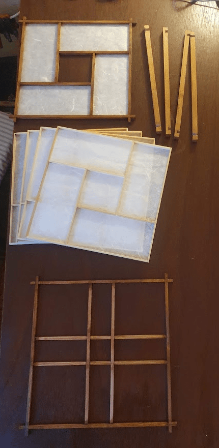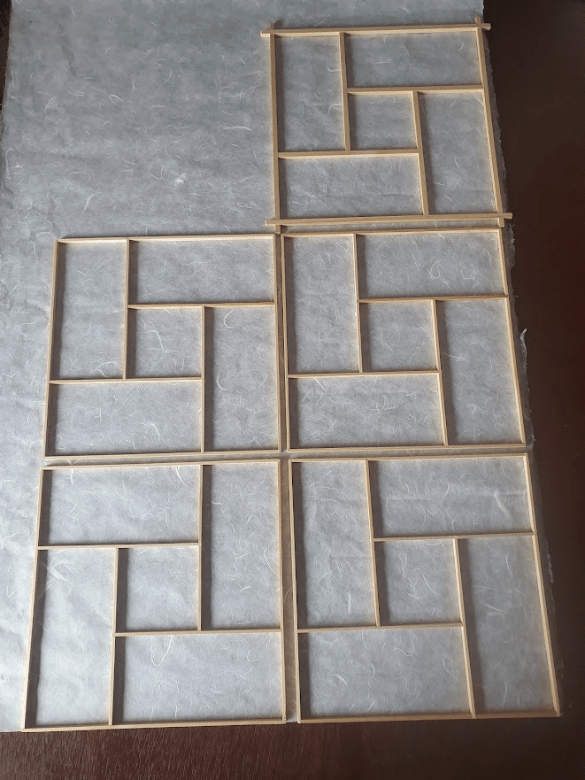 With renewed confidence I proceeded with gluing shoji (rice) paper on the frames of kumiko panels.