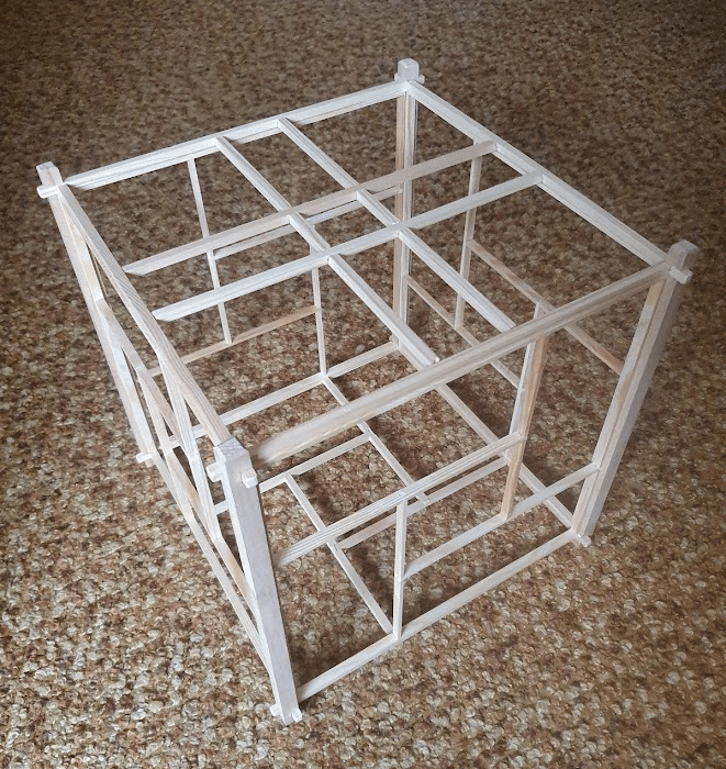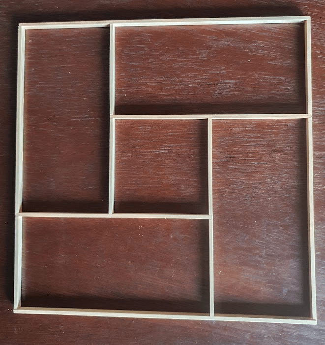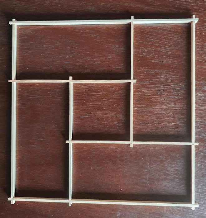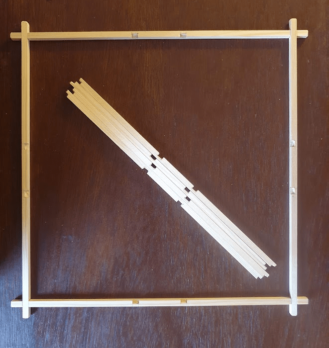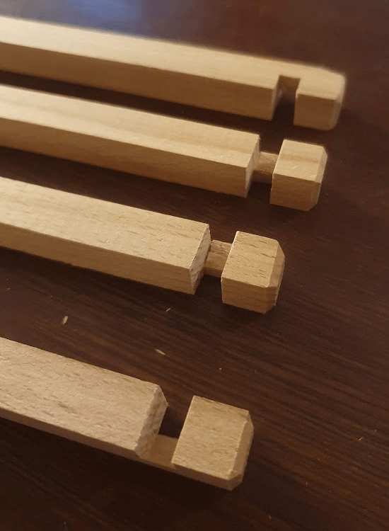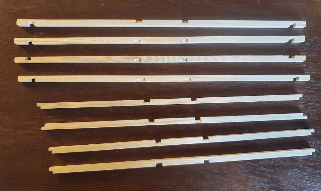 All the elements of the kumiko pattern have some margin on both sides. This makes assembling the panel frame easier and more precise. Once the glue dried, I cut the margins and sanded the joints.
