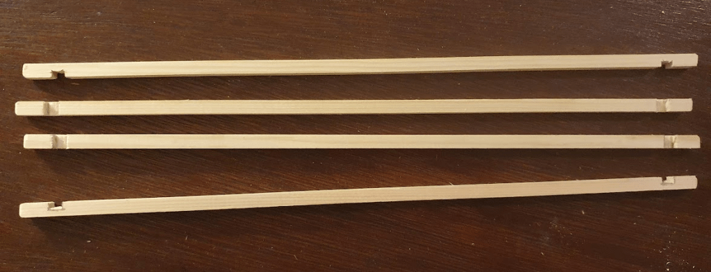 Once there and in breaks between festivities, I started with what I call the “corner pieces” and what I’ve seen called stiles by others. I cut them to length, made chamfers on top and bottom (using the chisel and sandpaper), and two-side slots for top and bottom frames (using the saw and the chisel).