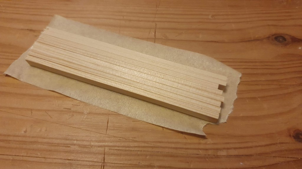 Making four side kumikos was simple and quick as the parts can be made in bulk. However, the problem was that the side panels are quite narrow which makes some of the elements too short to handle comfortably. So I used crepe tape to hold them together while processing them.
