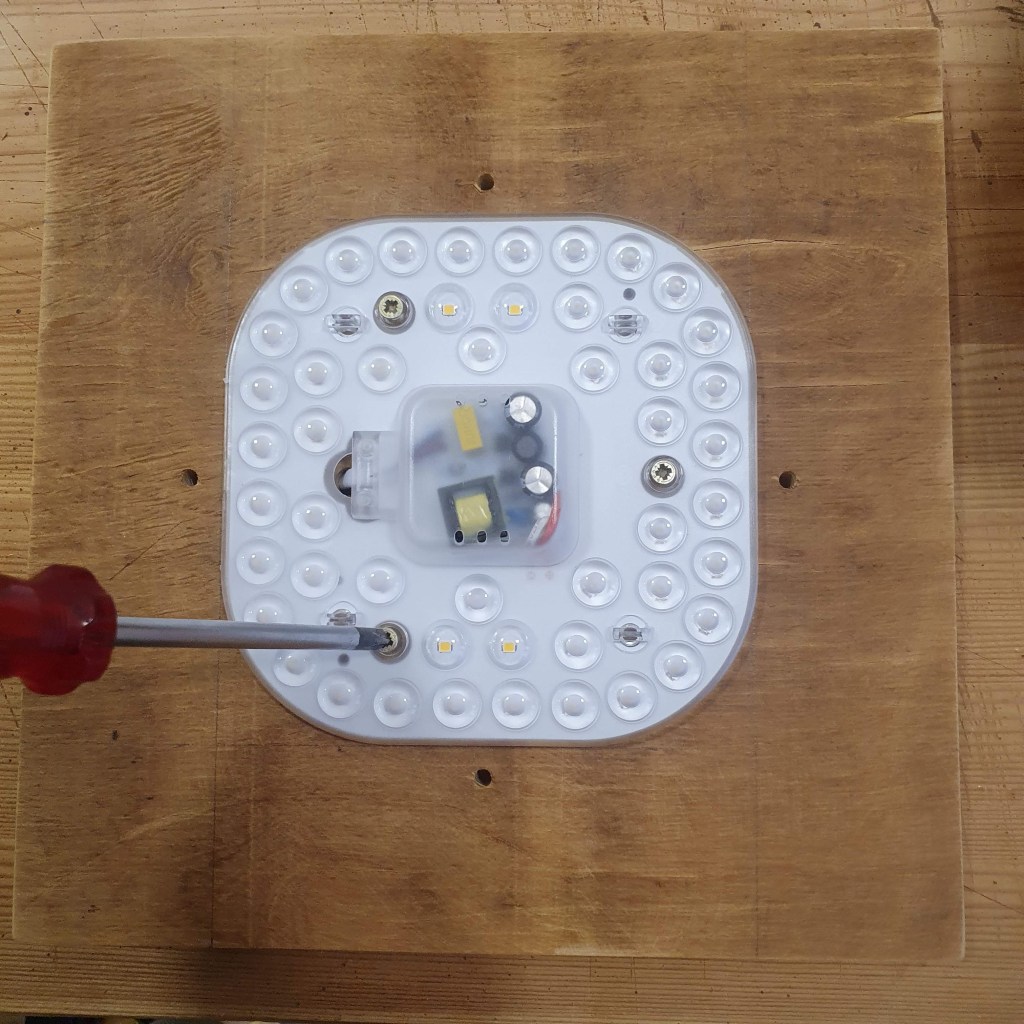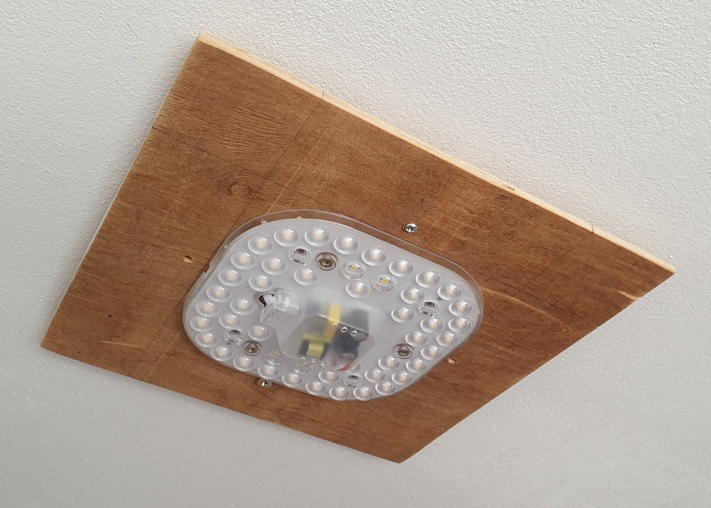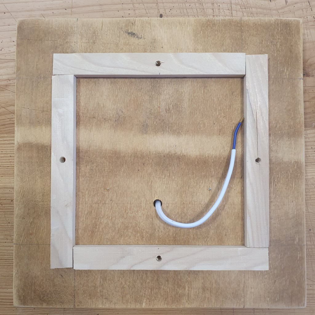While the glue on the shade was drying, I prepared the base of the lamp. It is made of a square piece of 5 mm plywood that was generously donated and cut to size on a table saw by my father. On the bottom, I attached a LED panel.